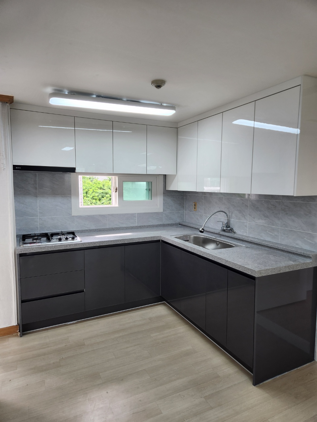 하이그로시 싱크대로 리모델링된 ㄱ자 주방입니다.
