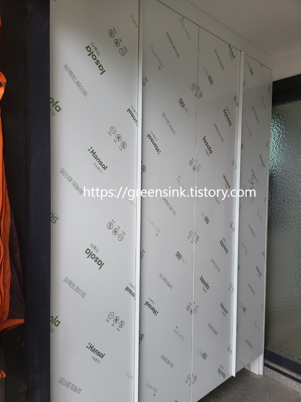 위에 적어둔 도어 PET페트 도어로 제작된 붙박이장 신발장입니다.